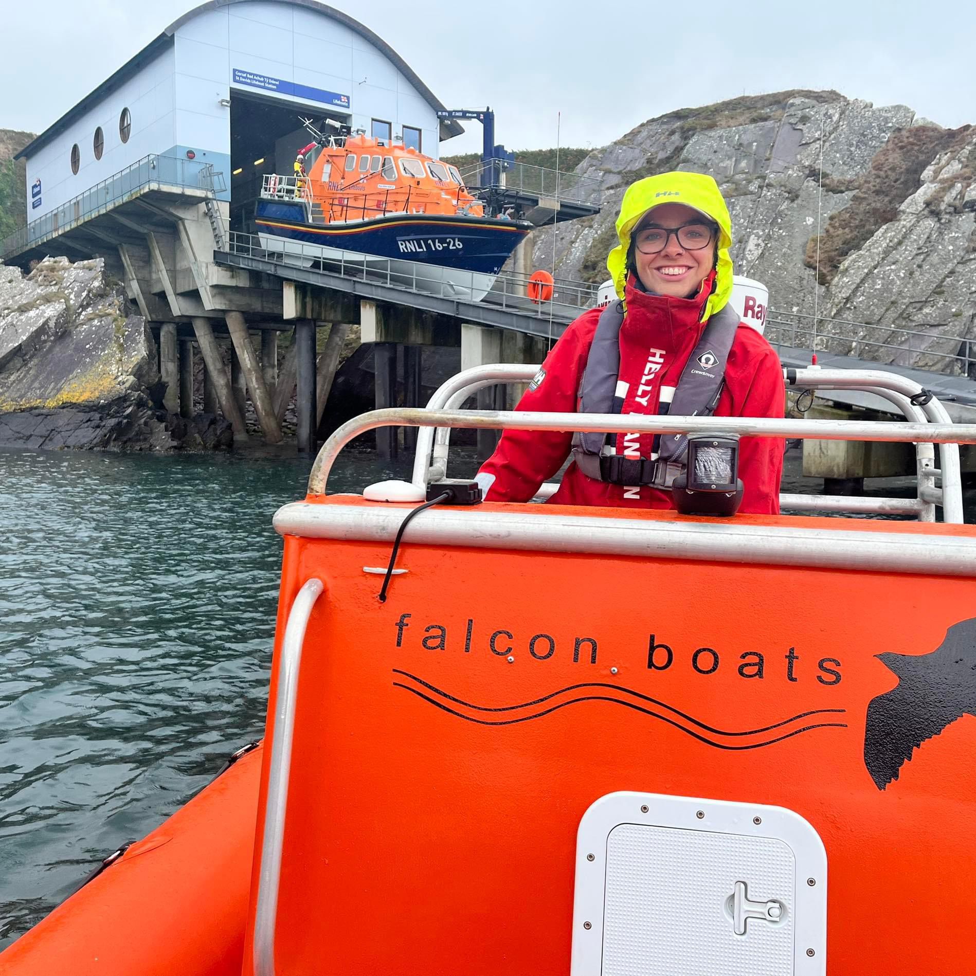 Ffion has been a member of the St David’s lifeboat crew for over 16 years, is a WISE accredited skipper, a powerboat instructor, a qualified Marine Mammal Observer and an author, having written a book about Ramsey which is published by Graffeg and available in our Falcon Boats shop.