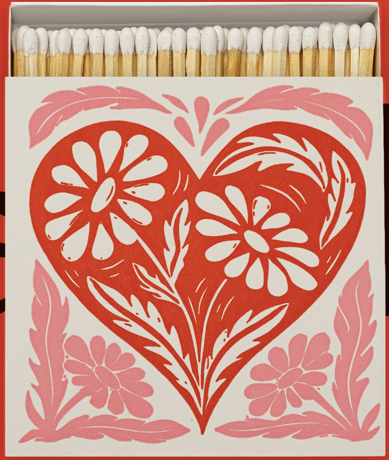 Our signature square matchbox featuring a red heart with pink and white botanical detailing.